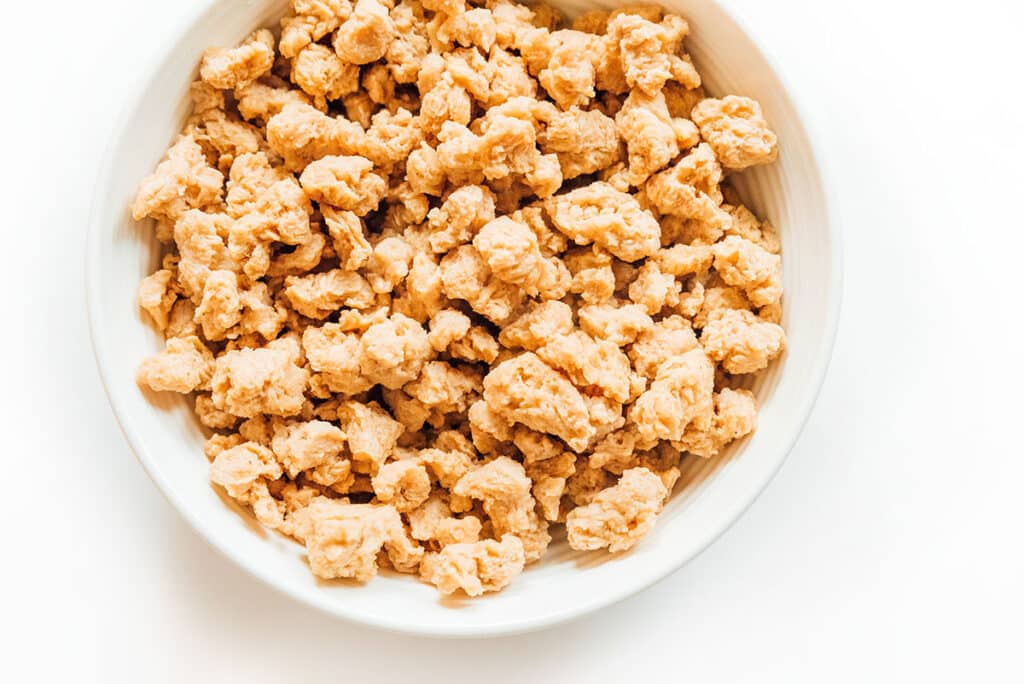 It’s made by taking soy flour — a byproduct of soy oil production — and removing the fat using solvents. The end result is a high-protein, low-fat product.